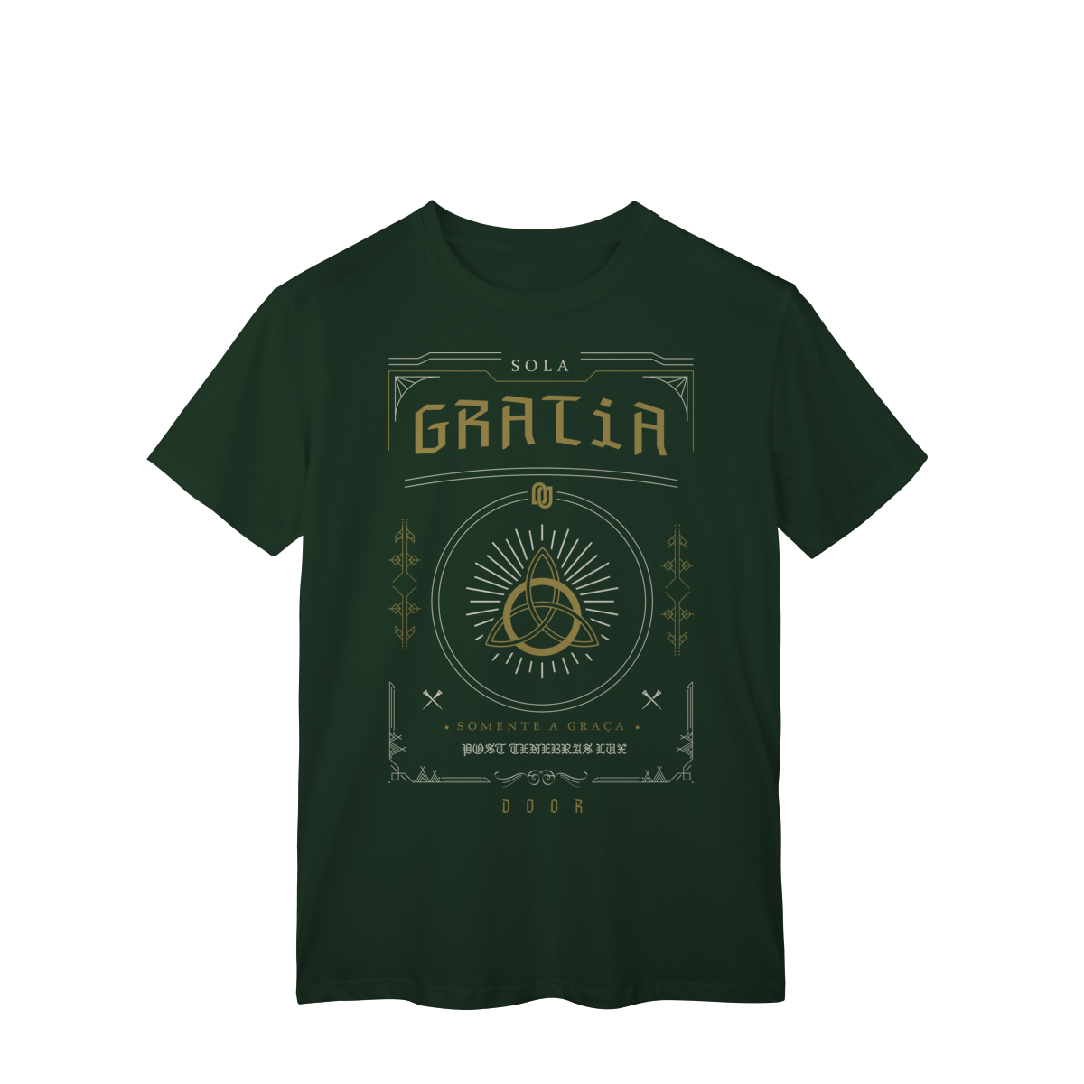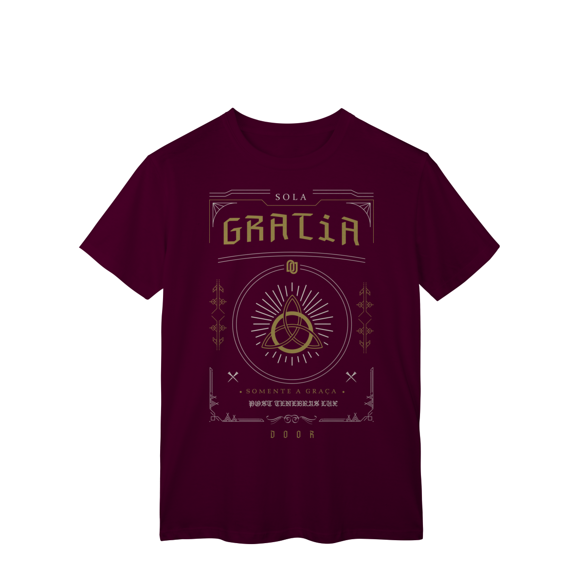 A camiseta Sola Gratia representa uma das cinco solas da Reforma Protestante: somente a graça. O design clássico traz o símbolo da Trindade envolto em raios de luz, acompanhado da expressão Post Tenebras Lux (“Depois das trevas, luz”), reforçando a verdade de que a salvação é exclusivamente um dom da graça de Deus, não resultado de méritos humanos.