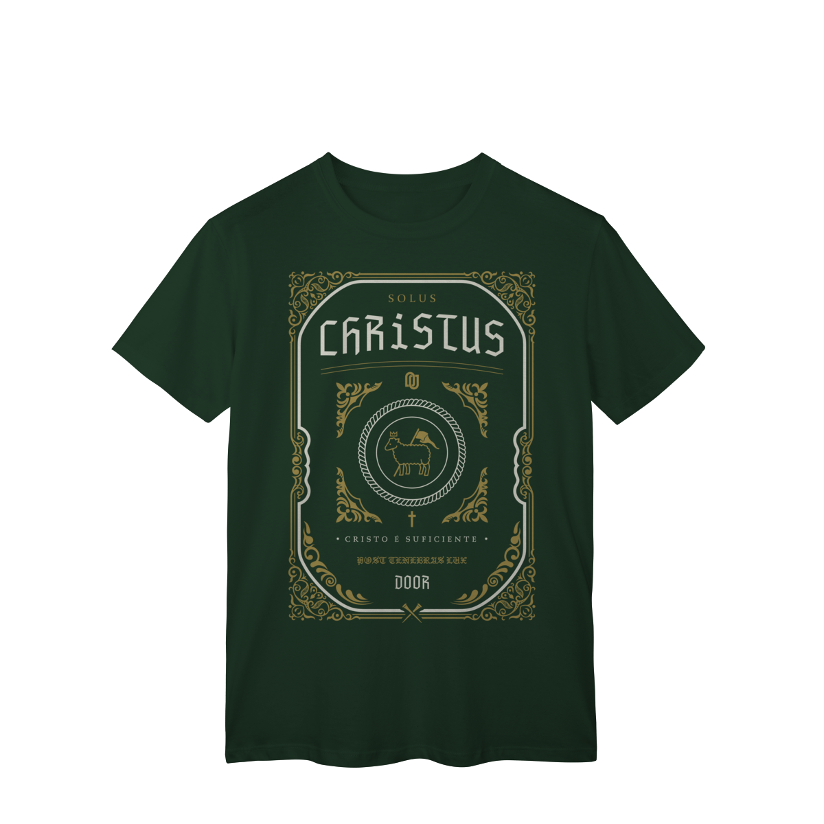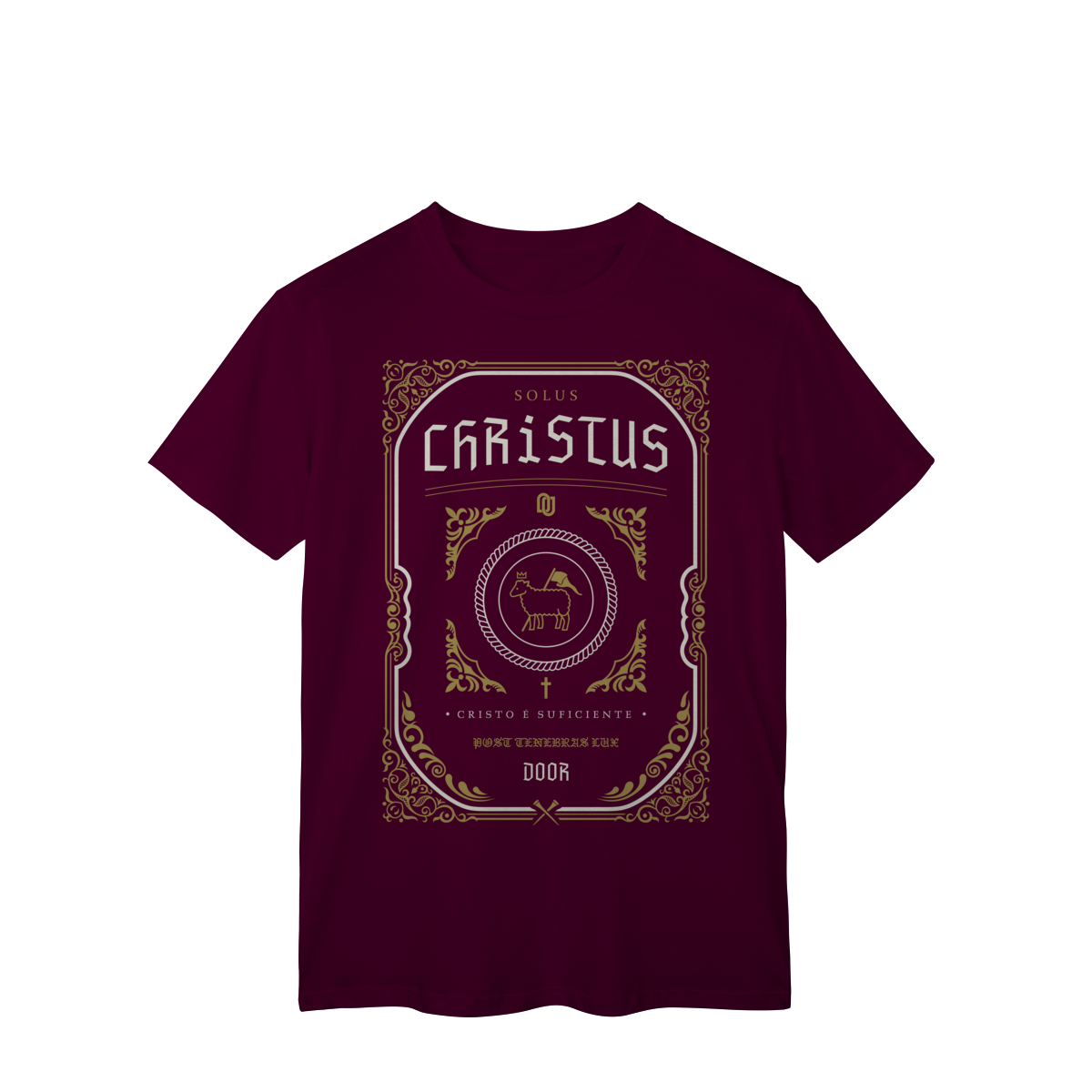 A camiseta Solus Christus celebra uma das cinco solas da Reforma Protestante: somente Cristo. A arte em estilo clássico traz o Cordeiro coroado, símbolo de vitória e sacrifício, acompanhada da frase Cristo é suficiente e da expressão latina Post Tenebras Lux (“Depois das trevas, luz”), lembrando que apenas Jesus é o caminho, a verdade e a vida.