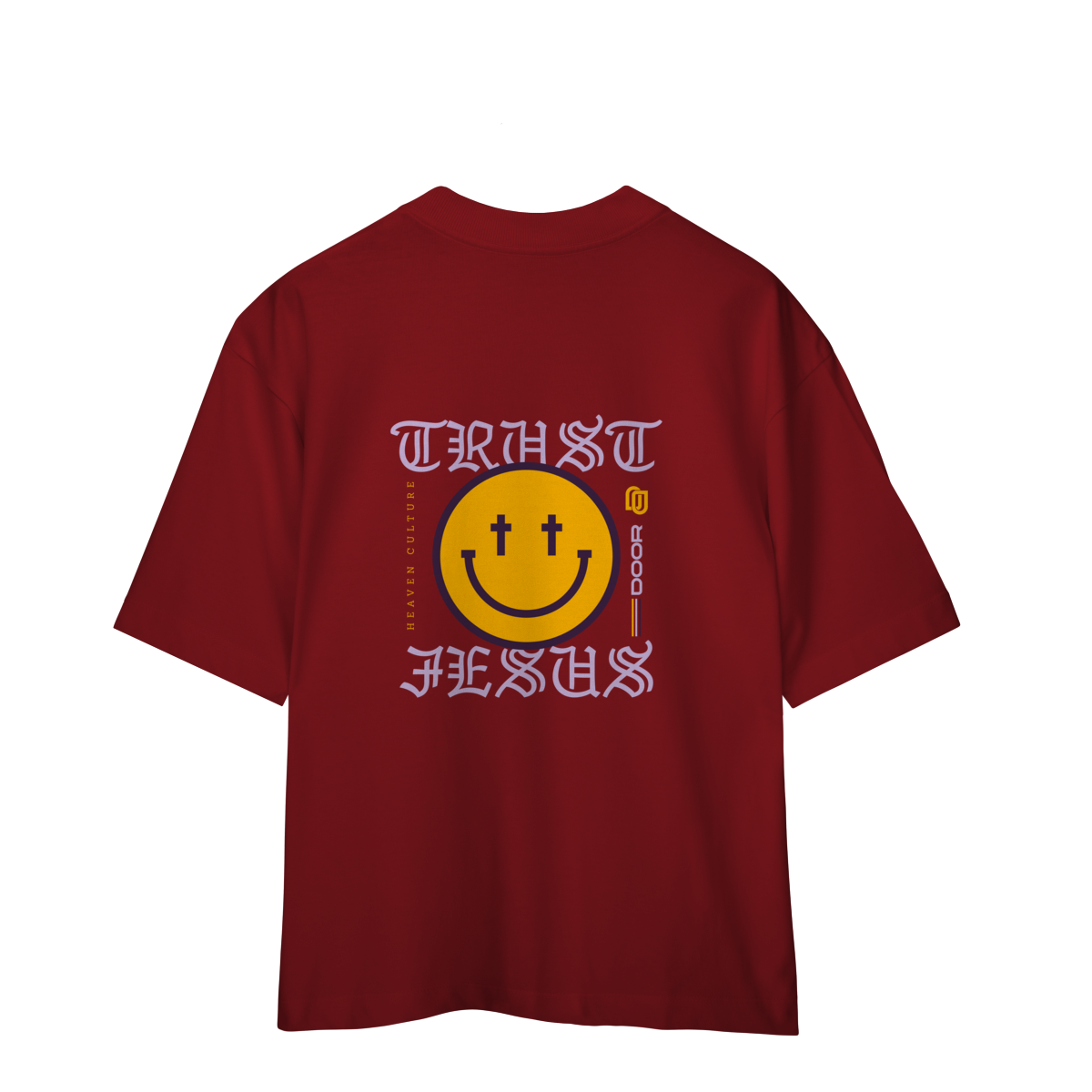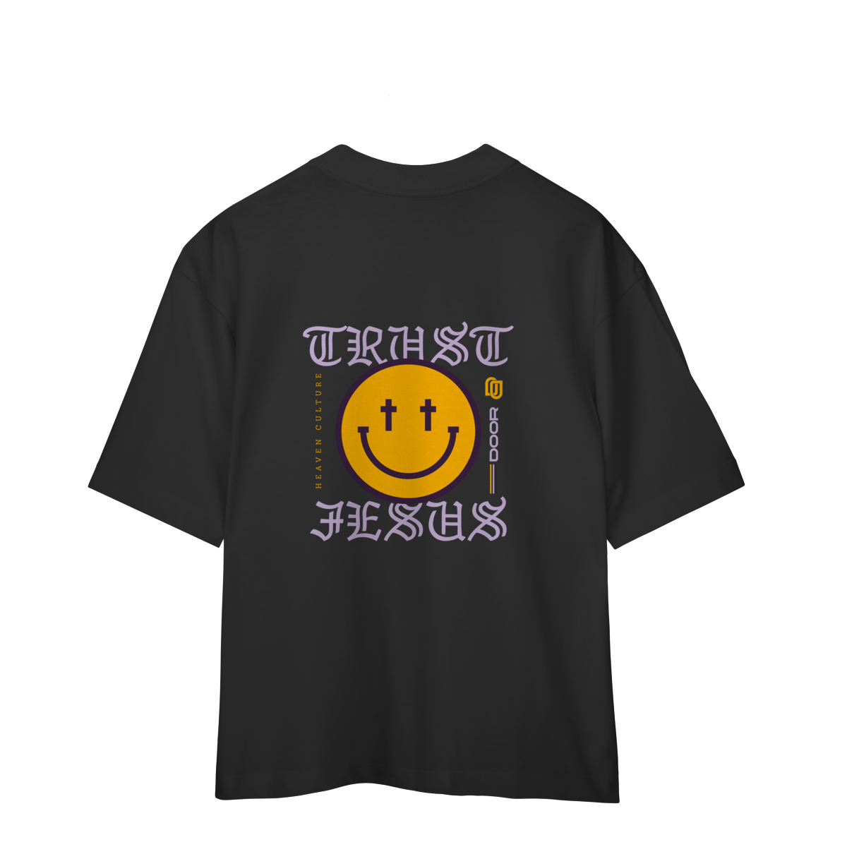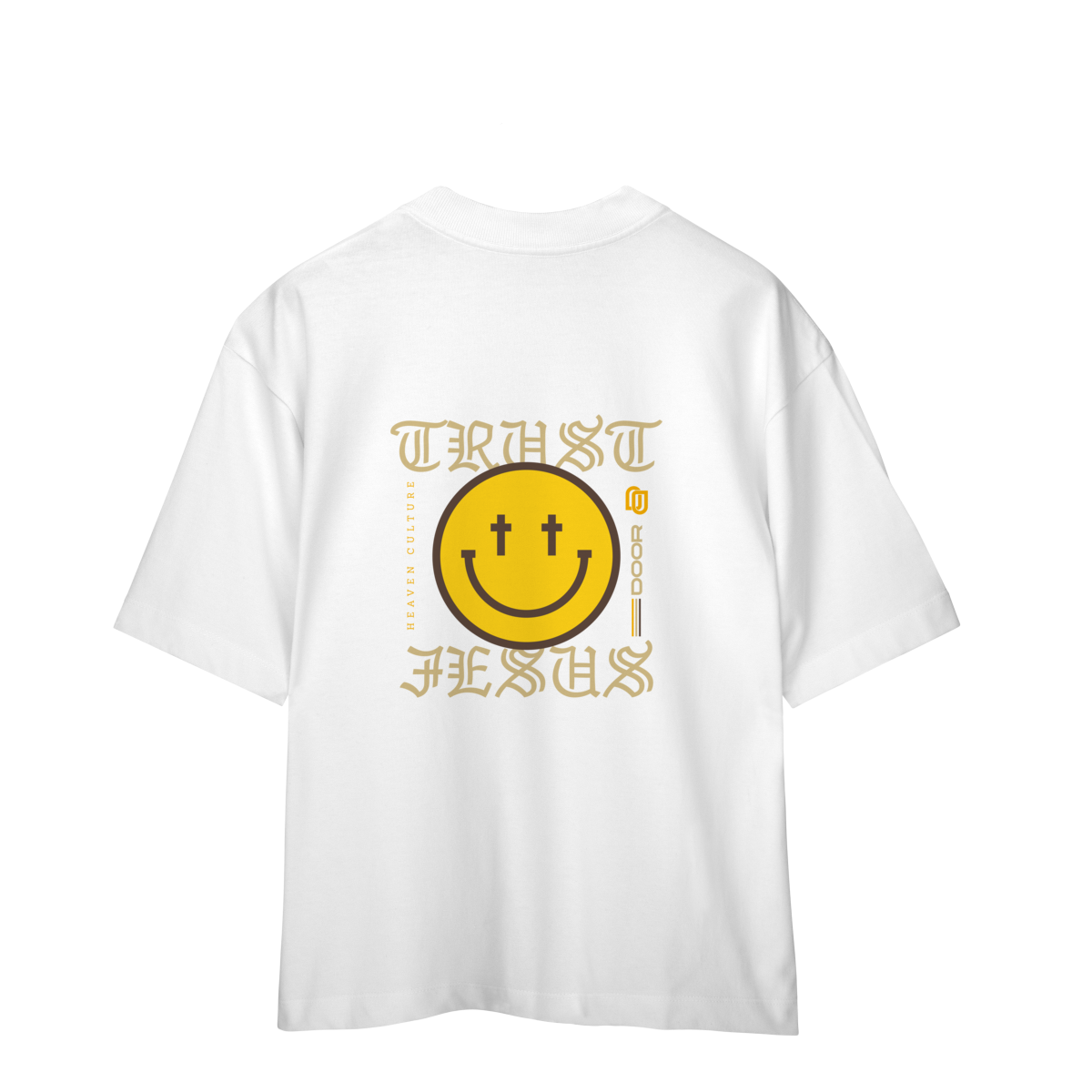 Simples, direta e cheia de significado: a camiseta Trust Jesus une o clássico do streetwear com a mensagem eterna do Evangelho. O smile retrabalhado com cruzes no lugar dos olhos transmite alegria e fé, lembrando que confiar em Jesus é viver com esperança verdadeira.