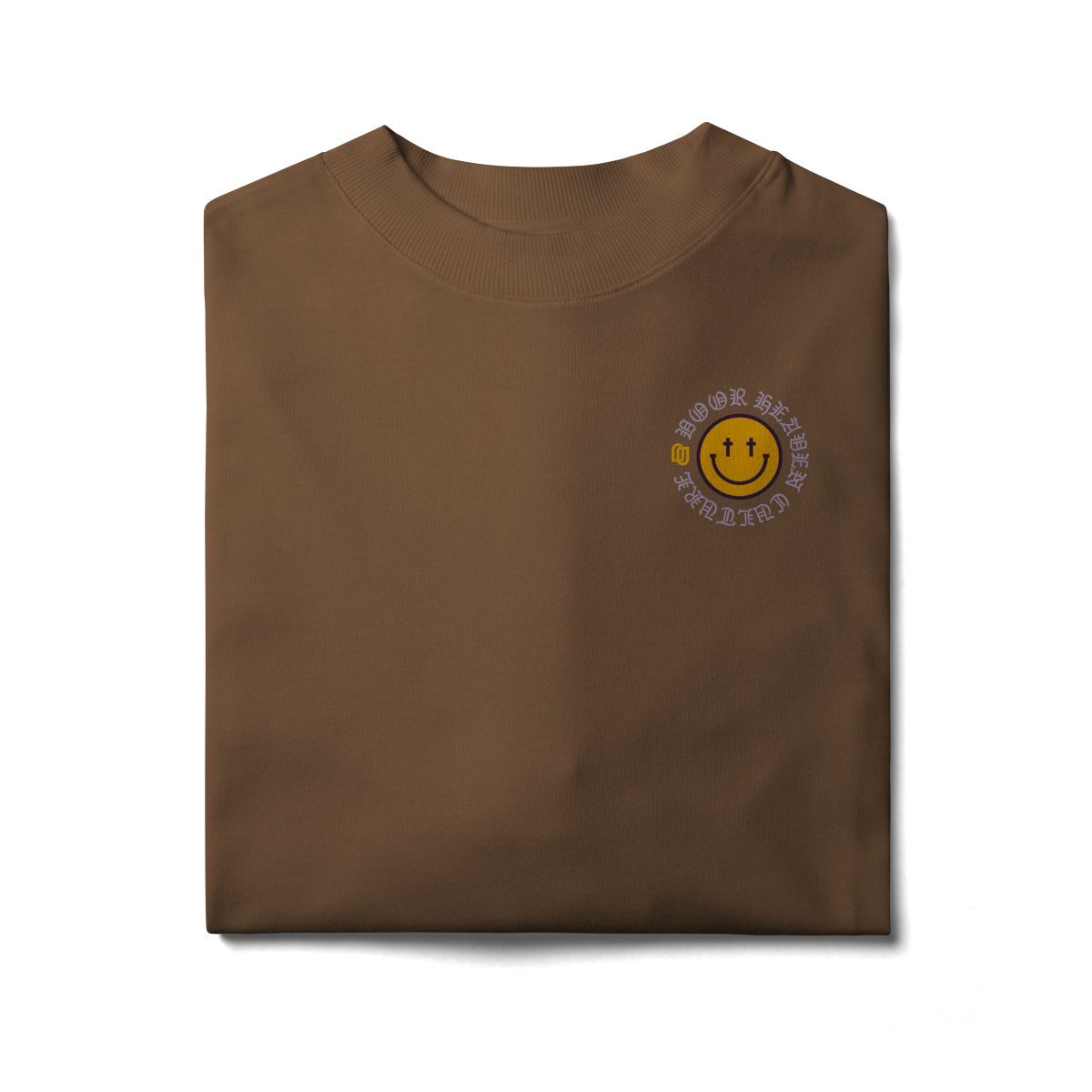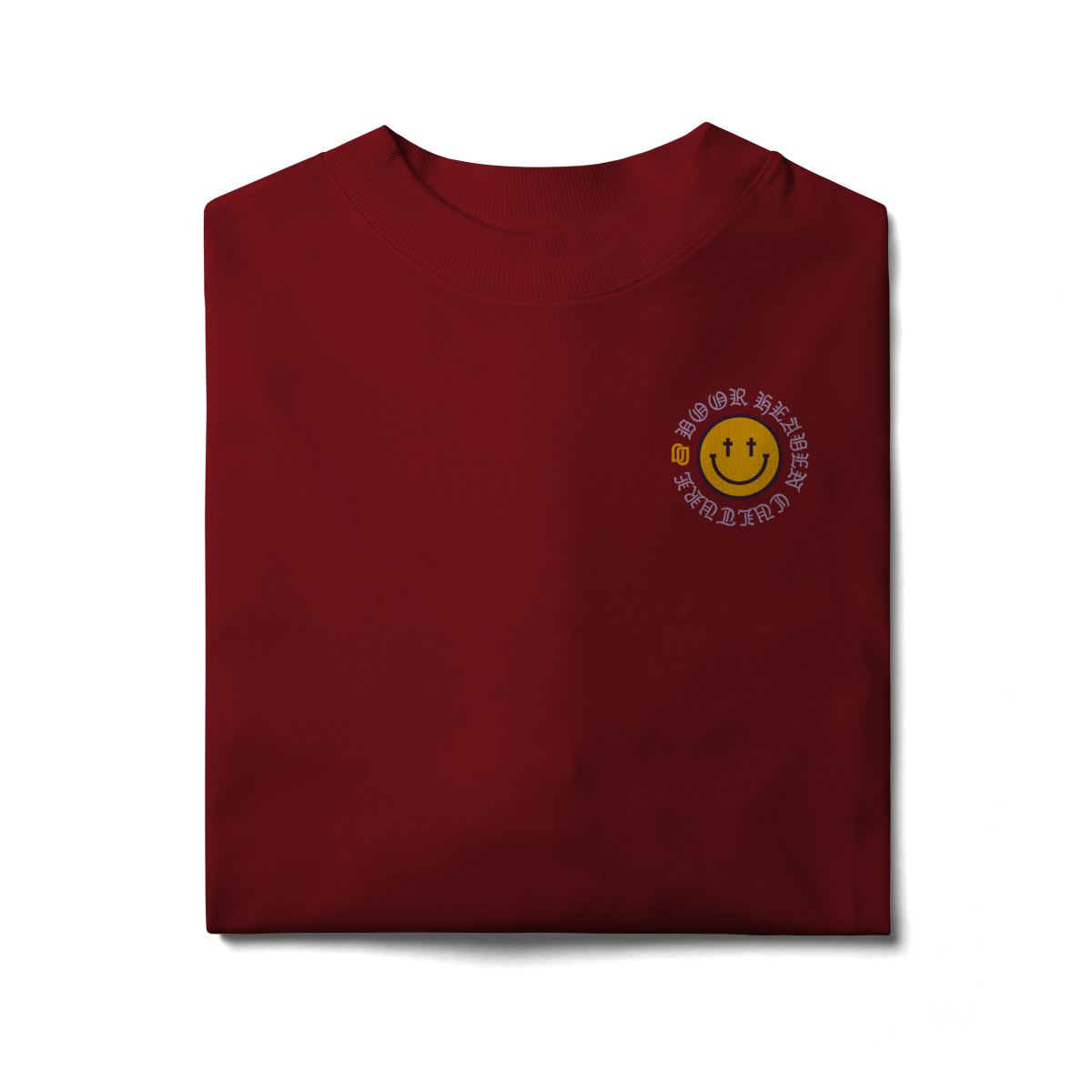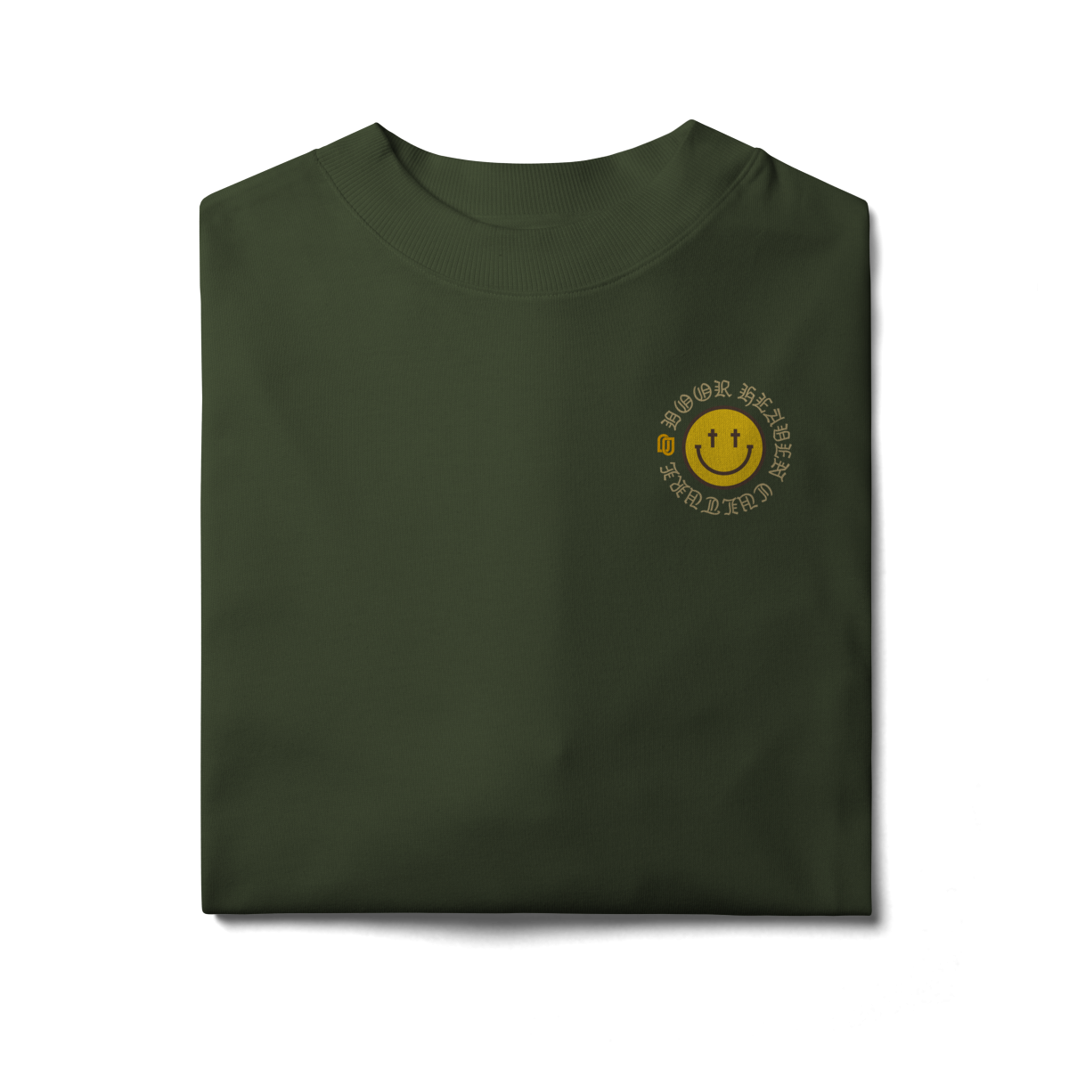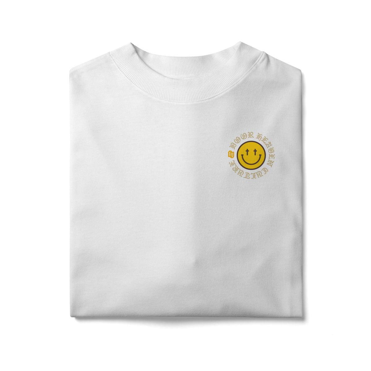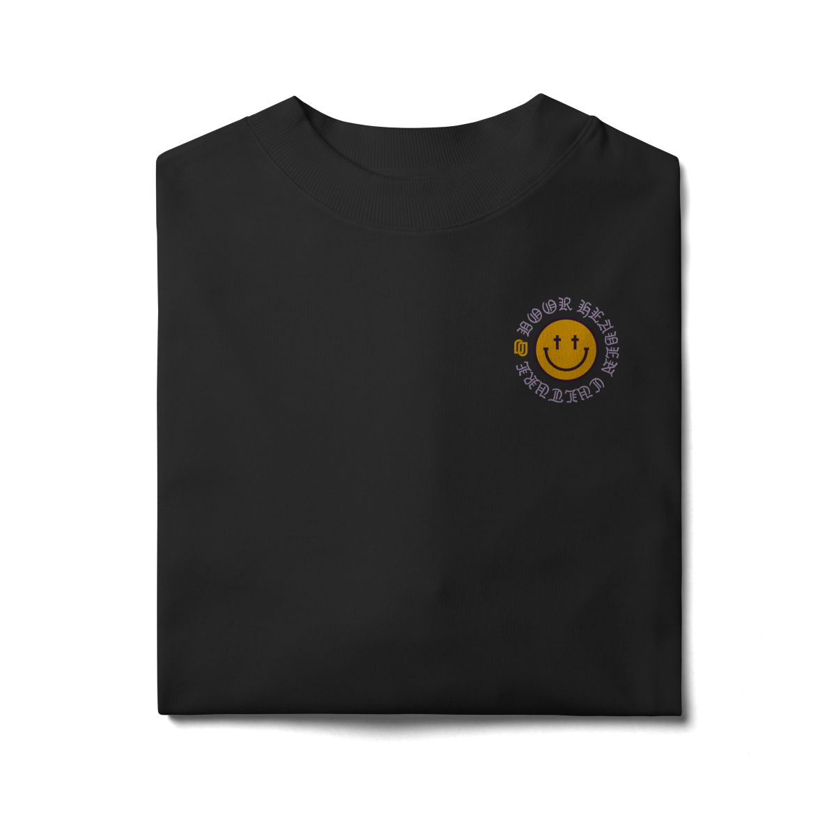 Feita em algodão premium, com modelagem oversized e caimento moderno, essa peça traz conforto e atitude em qualquer ocasião. A tipografia gótica contrasta com o ícone pop do smiley, criando um visual único que conecta cultura urbana e espiritualidade.