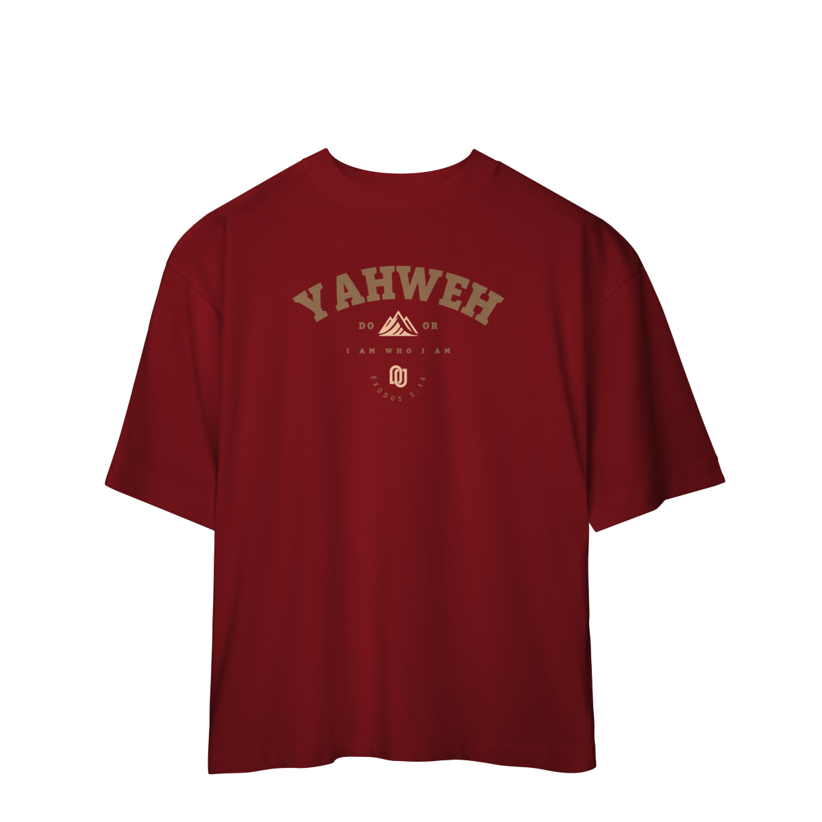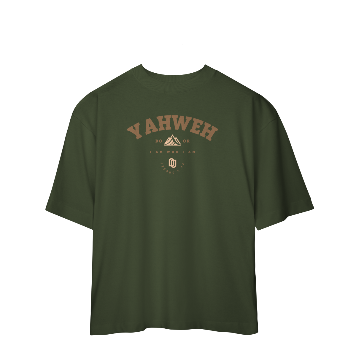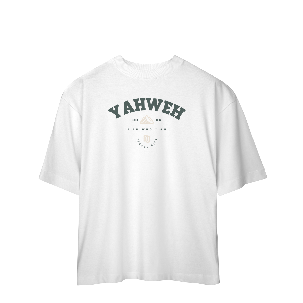 A camiseta Yahweh traz em destaque o nome santo revelado a Moisés em Êxodo 3:14: “Eu Sou o que Sou”. A arte mistura tipografia imponente com o símbolo da montanha, remetendo à grandeza e eternidade de Deus.